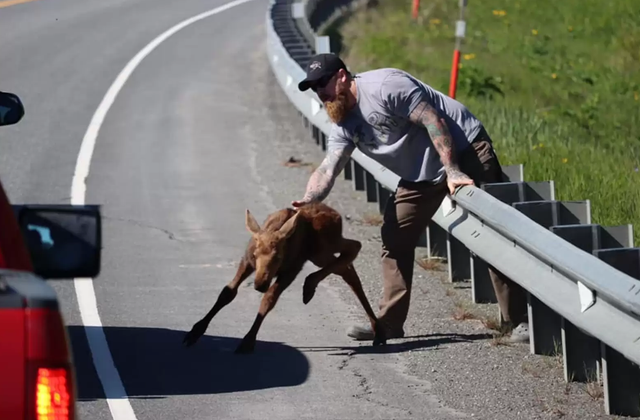 Чоловік дочекався, коли смуга руху відгородила маму від лосеняти й кинувся до малюка. У цей час друзі загородили тварині огляд, а Джо підхопив маленьку істоту на руки й переніс через огорожу. Це допомогло лосеняті возз'єднався з матір'ю й позбутися корку на дорозі.