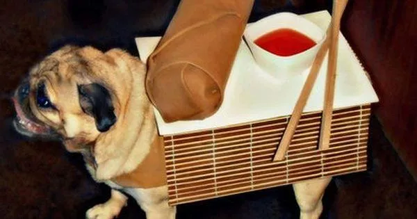 Костюмна оригінальність може бути корисною. Власник одягнув свого улюбленця в креативне вбрання, яке слугує підставкою для суші.