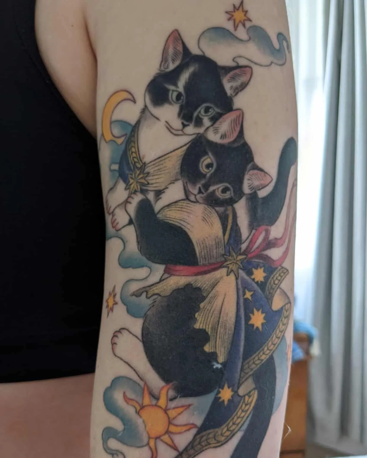 Люси Паллетт из Большого Уикомба сделала тату с котами Цирце и Юноной месяц назад. Желание сделать тату с любимцами она вынашивала целых 13 лет, но никак не могла встретить нужный дизайн. К счастью, она встретила тату-мастера Киру, которая смогла выполнить все пожелания.