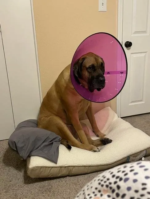 Против конуса собака не имеет ничего против. Но как только на неее надели девайс розового цвета, ее веселое настроение сразу исчезло.
