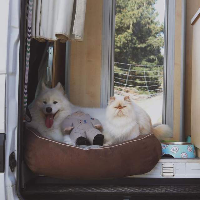 Они живут веселой жизнью с владелицей Ринс Ли в Новой Зеландии. Все трое путешествуют по живописным местам и фотографируются в стиле "инь и янь". Песик Каспер породы самоед всегда излучает радость и улыбку.