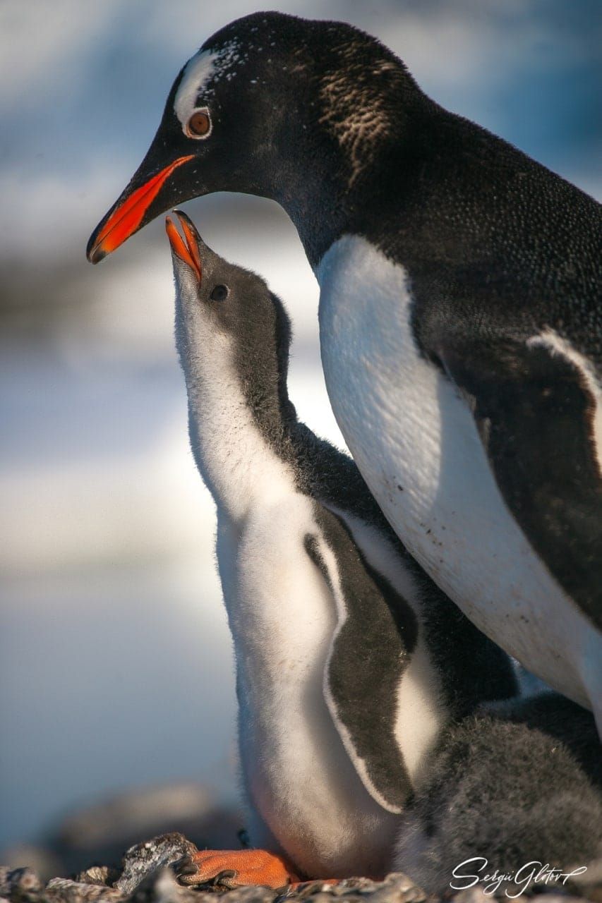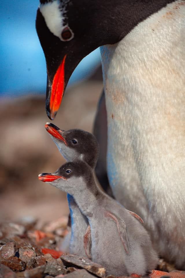 За словами вчених, пташенята ще залишаються в гнізді і повністю залежать від батьків. Мама і тато годують їх по черзі крилем, що ловлять в океані. Щоб поїсти, пінгвіненята залазять дзьобом у рот до своїх батьків. Полярники жартують, що з боку це може виглядати так, ніби дорослий пінгвін намагається проковтнути малюка.