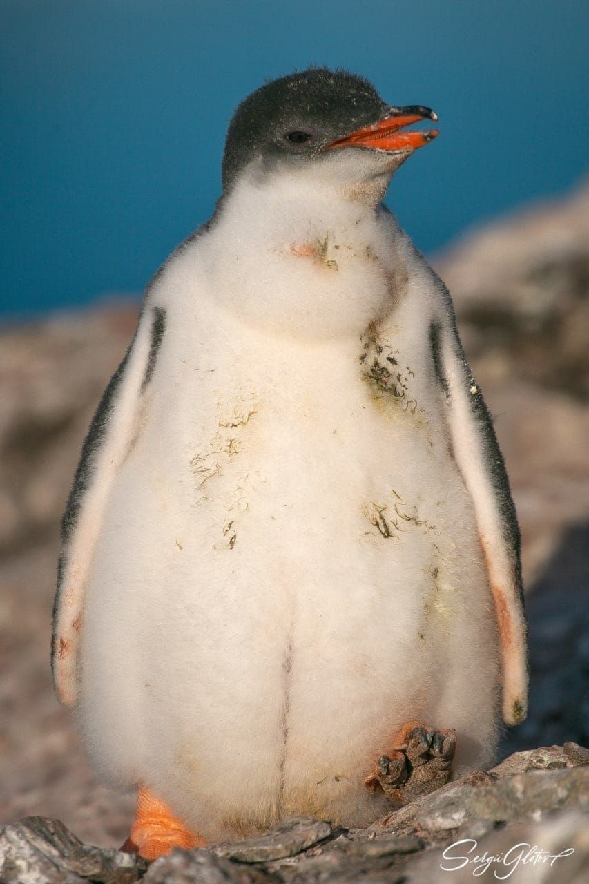 Зараз їм близько місяця. Сірий пушок став біло-сірим, а зовсім скоро малюки почнуть линяти та міняти його на пір'я, як у дорослих пінгвінів.